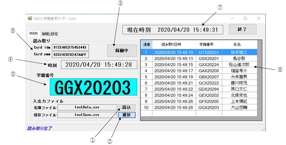| 4 | 読込時刻 | 学籍番号を読み込んだ時刻です。パソコンのシステム時刻を使用します。 |