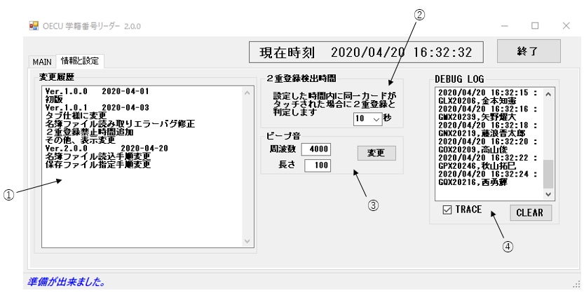 | 6 | データ一覧 | 時刻、学籍番号、氏名を一覧表示します。ただし、名簿ファイルを読み込んでいない場合、氏名は表示されません。 |