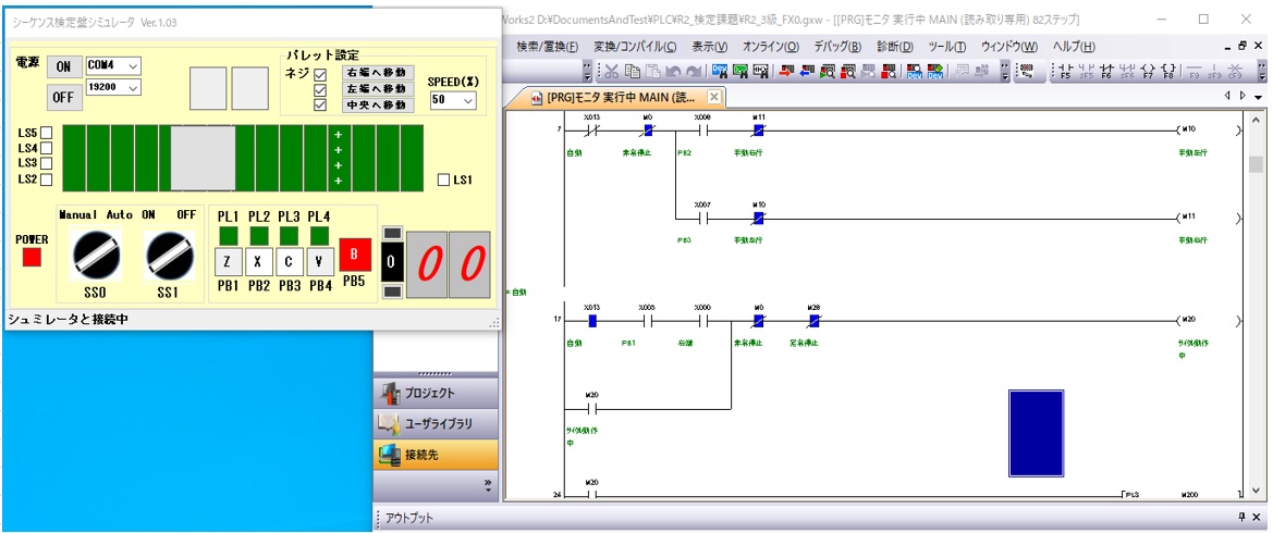 上の動画は、3級と2級の問題を組み合わせて作ったシーケンスプログラム(ラダー)で動かしています。