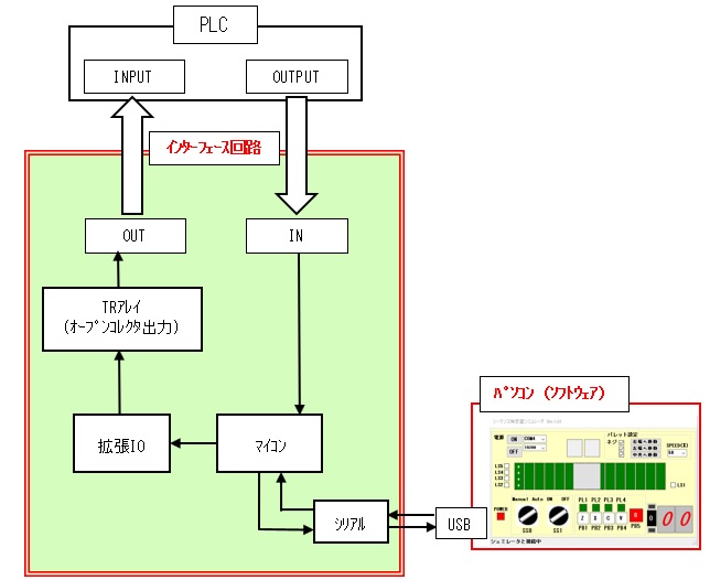 本シミュレータを実現する上で、パソコン用ソフトウェアだけでなく、ハードウェア(パソコン-PLC間のインターフェース回路)